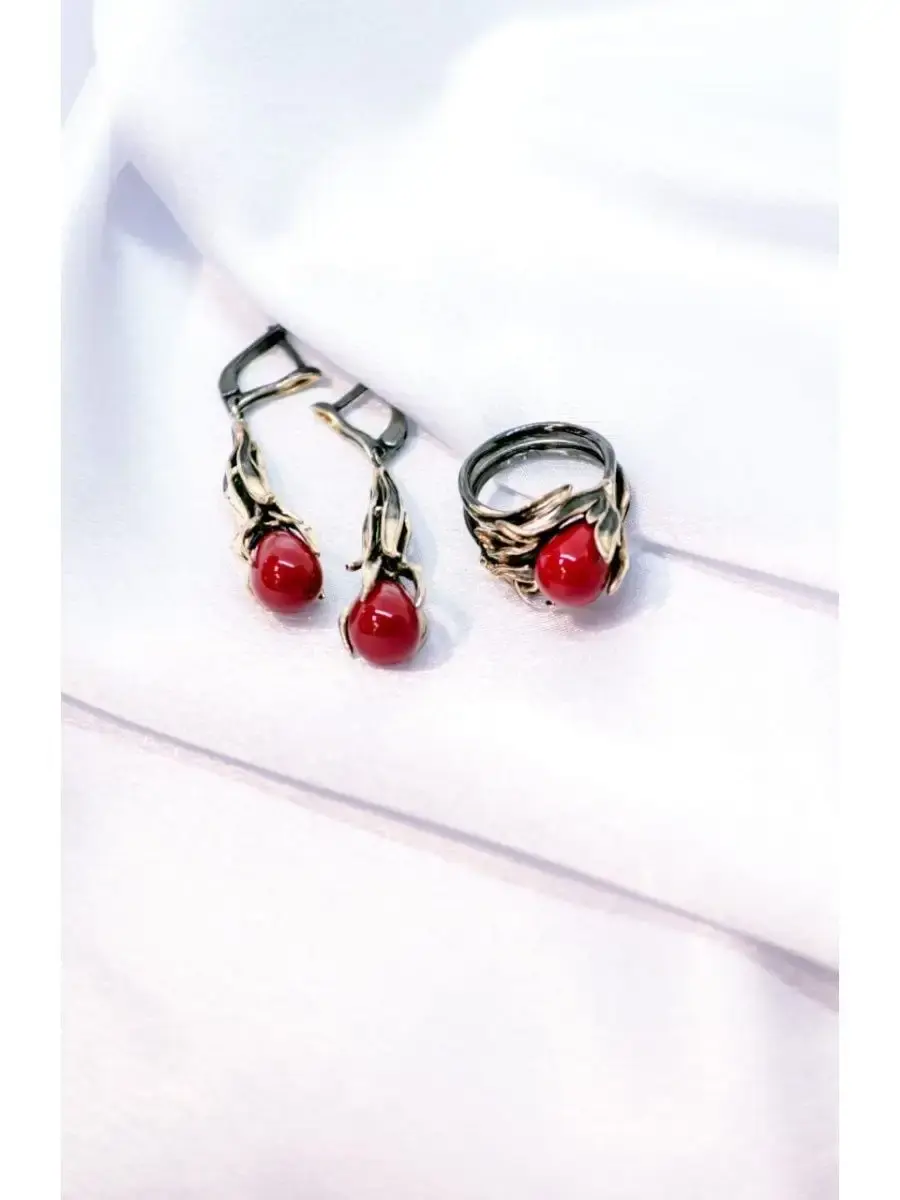 Набор кольцо и серьги женские. Вставка: Искусственный Коралл, серебро 925 пробы (позолота).Серьги 12.83 грамм. Кольцо 9.66 грамм. Кольцо безразмерное. Значение веса на фото и в характеристиках являются примерными и могут отличаться от фактического.