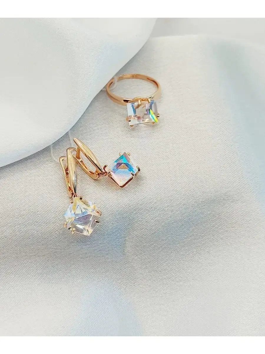 Комплект с радужным кварцем. Золото 585 пробы.Серьги - 3.78 грамм,Кольцо- 2.06 грамм. Элегантный комплект от бренда "Золотая Симфония" станет любимым вашим украшением. Подходит как для вечернего образа, так и для повседневной носки. Отличный подарок для всех дорогих сердцу дам. Преподнести его уместно на рождественское и новогоднее торжество, годовщину свадьбы или отношений и день рождения, также на юбилей или День Влюбленных, 8 марта и абсолютно любой другой без исключения праздник.Этот презент непременно порадует любимую девушку и сестру, дочку и маму, жену и лучшую подругу. Он обязательно вызовет восторг у бабушки и коллеги, тети и крестницы, племянницы и крестной. Ведь стильные и многофункциональные украшения обязательно займут почетное место в каждой женской коллекции. Они отличаются прочностью и долговечностью.