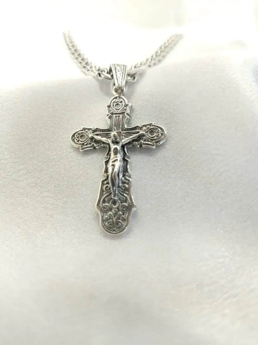 Подвеска Крест серебро. вес 7.6 гр. Размер без ушка: длина 4.4 см *2.9. Ушко 1 см. Нательный крест - Серебро 925 пробы с оксидированием поверхности. Значение веса в характеристиках является средним и может отличаться от фактического. Серебряная подвеска приходит с подарочной коробкой, как готовый вариант в качестве подарочного набора. Найти украшения нашего бренда можно также по запросу "Золотая Симфония" далее текстом: цепочка на шею, цепочка серебро 925, цепочка серебряная, цепочка мужская, серебро цепочка 925, крестик серебряный, крест, подарок на крестины, цепочка с крестиком, крест мужской, серебряный крестик мужской, рождественский подарок, православное украшение, подвеска крест, крест серебряный мужской, кулон подвеска, подарок мужчине, подарок парню, папе, подарок мужу, подвеска мужская, крестик серебро мужской.