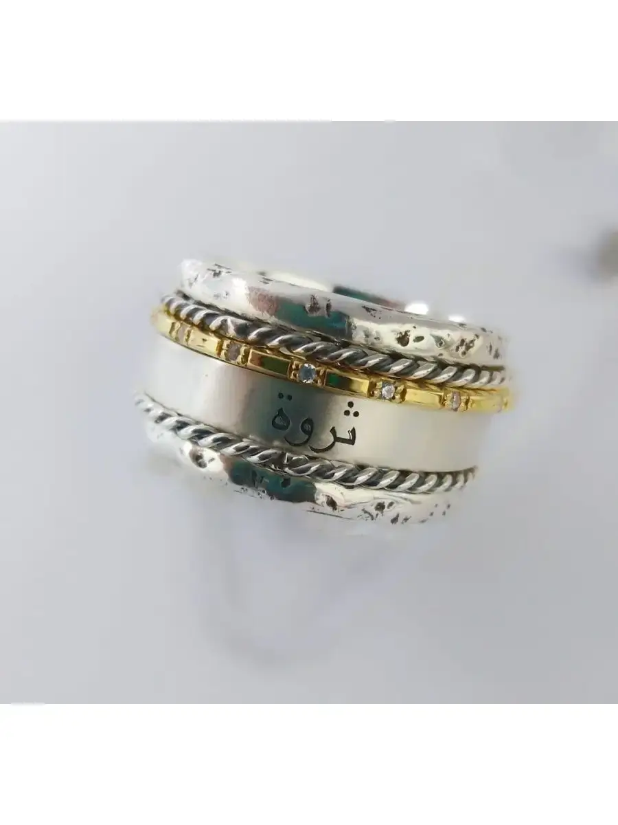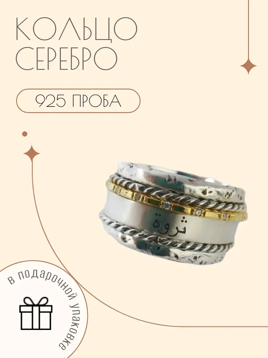 Серебряное кольцо - антистресс "Богатство" (надпись на арабском языке) с подвижным элементом. Вставка: фианит. Средний вес: 9 грамм. Изделие выполнено из серебра 925 пробы и имеет подвижный элемент. На кольце выгравирована надпись "Богатство" (надпись на арабском языке). Женское кольцо бренда "Золотая Симфония" можно прибрести, как подарок любой женщине: подруге, девушке, любимой, жене, девочке, дочке, сестре, бабушке, коллеге, которую хочется порадовать просто так или на новый год, годовщину, день рождения, 8 марта, свадьбу, выпускной, на 14 февраля, день всех влюбленных, день матери. В ассортименте бренда большой выбор ювелирных украшений из серебра 925 пробы и золота 585 пробы. Вы можете найти кольца, помолвочные кольца, печатки, а также серьги пусеты (гвоздики), конго, трансформеры, протяжки.