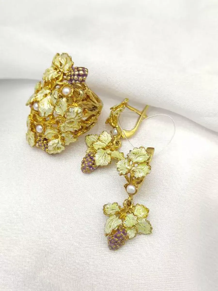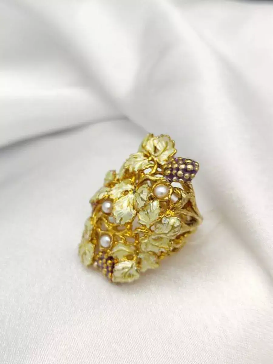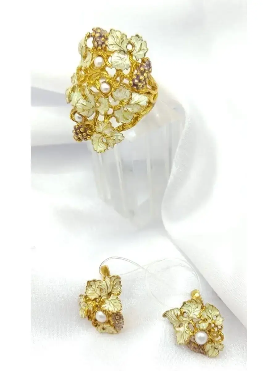 Кольцо женское "Лоза" - символ плодородия и богатства. Серебро 925 пробы. Цвет лимонное золото. Вставка: эмаль, стразы, жемчуг. Кольцо - 15.72 грамм (безразмерное)