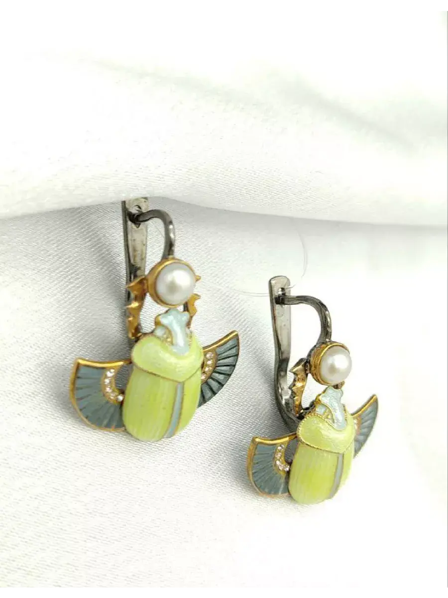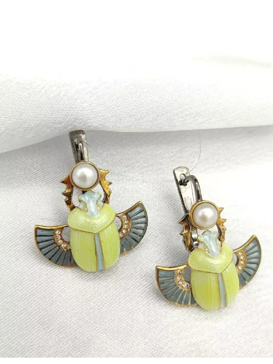 Серьги серебро 925 пробы. Вставка: эмаль, стразы, жемчуг. В комплект женских украшений входит: Серьги - 11.49 грамм, Кольцо - 15.96 грамм (безразмерное).(в рекомендациях) Будьте неотразимы в наших украшениях!