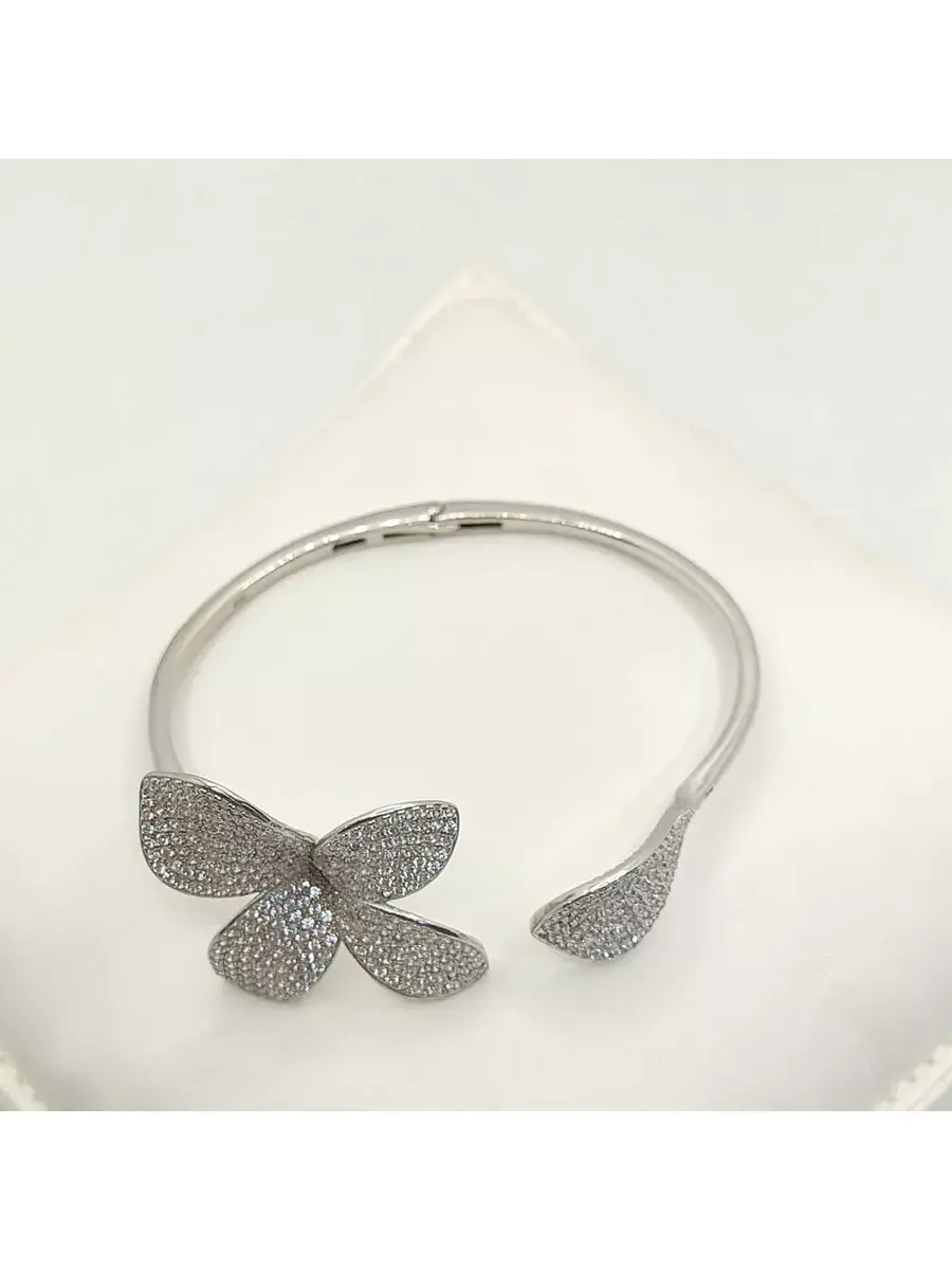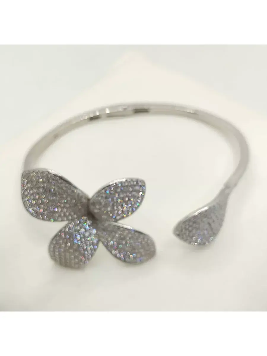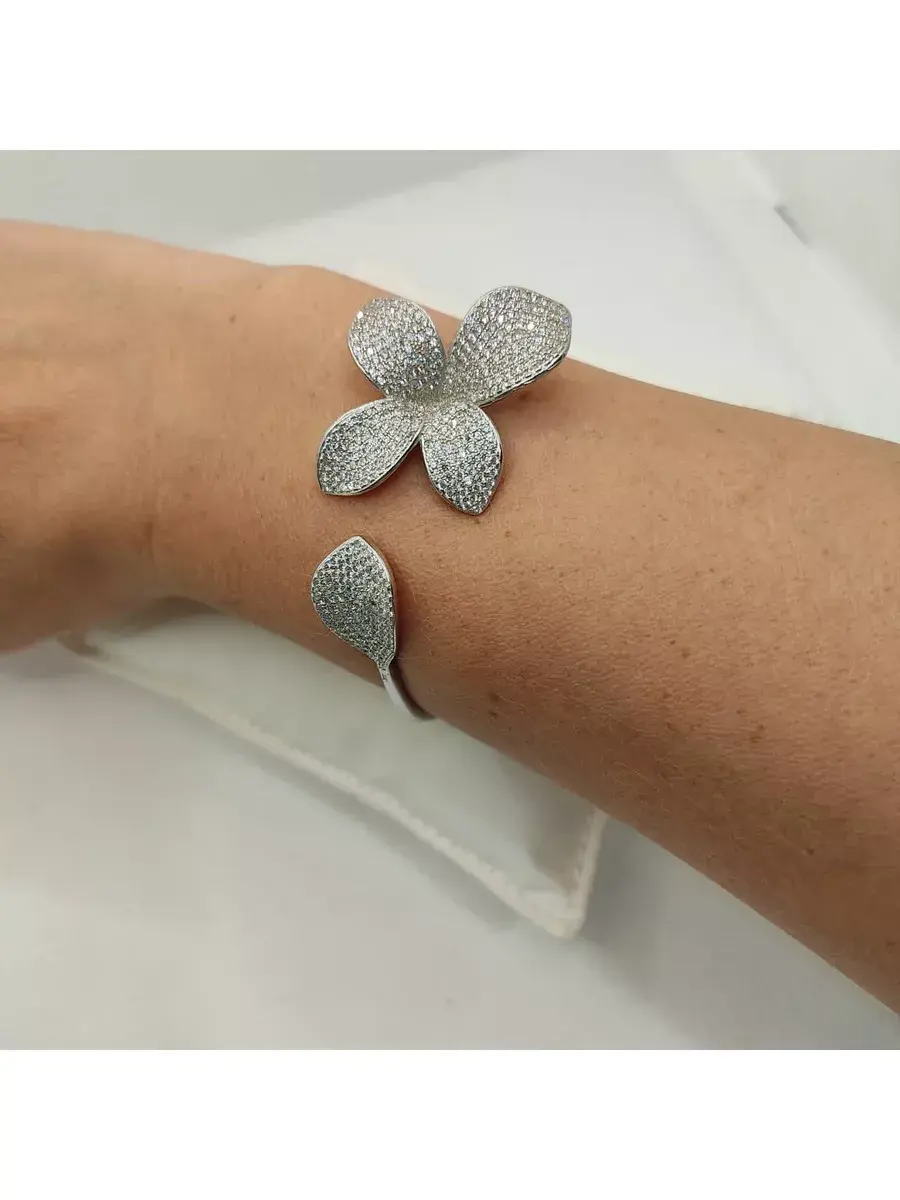 Ювелирное украшение браслет жесткий в форме цветка с переливающимися фианитами. Масса изделия: 17.46 грамм. Браслет женский серебряный имеет индивидуальный стиль, в основе которого необычайный синтез классики, инкрустирован фианитами. Все элементы изделия выполнены из серебра 925, присутствует проба. Изделие комплектуется подарочной упаковкой. Ювелирный браслет женский - идеальный подарок на любой праздник.